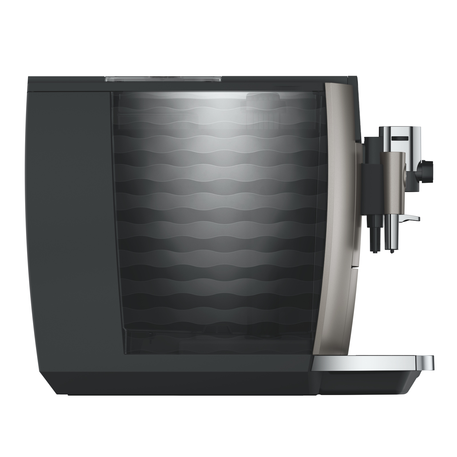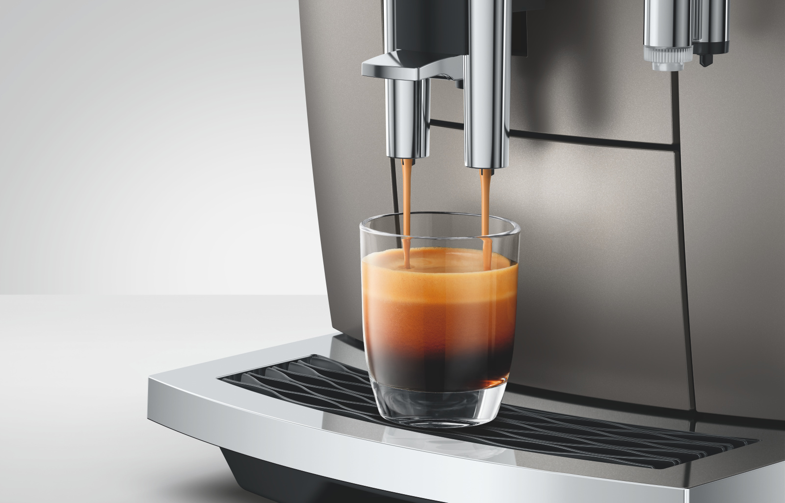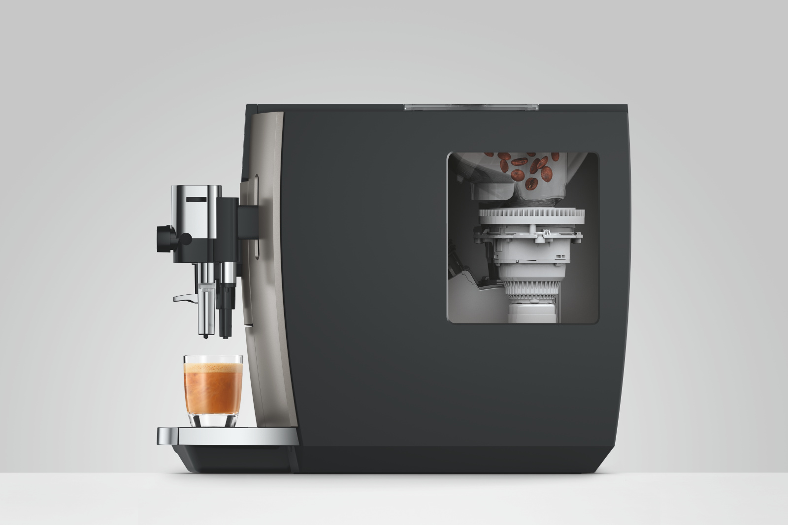 Kávovar E8 září svým stylem, a díky šířce 27 cm, zaujme v menších kuchyních působivou pozici; co do designu i požitku z kávy.